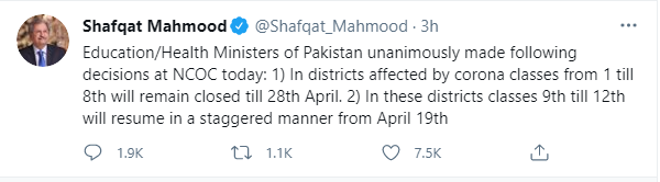 Following is the tweet of Education Minister Shafqat Mahmood Regarding the decision on closing schools