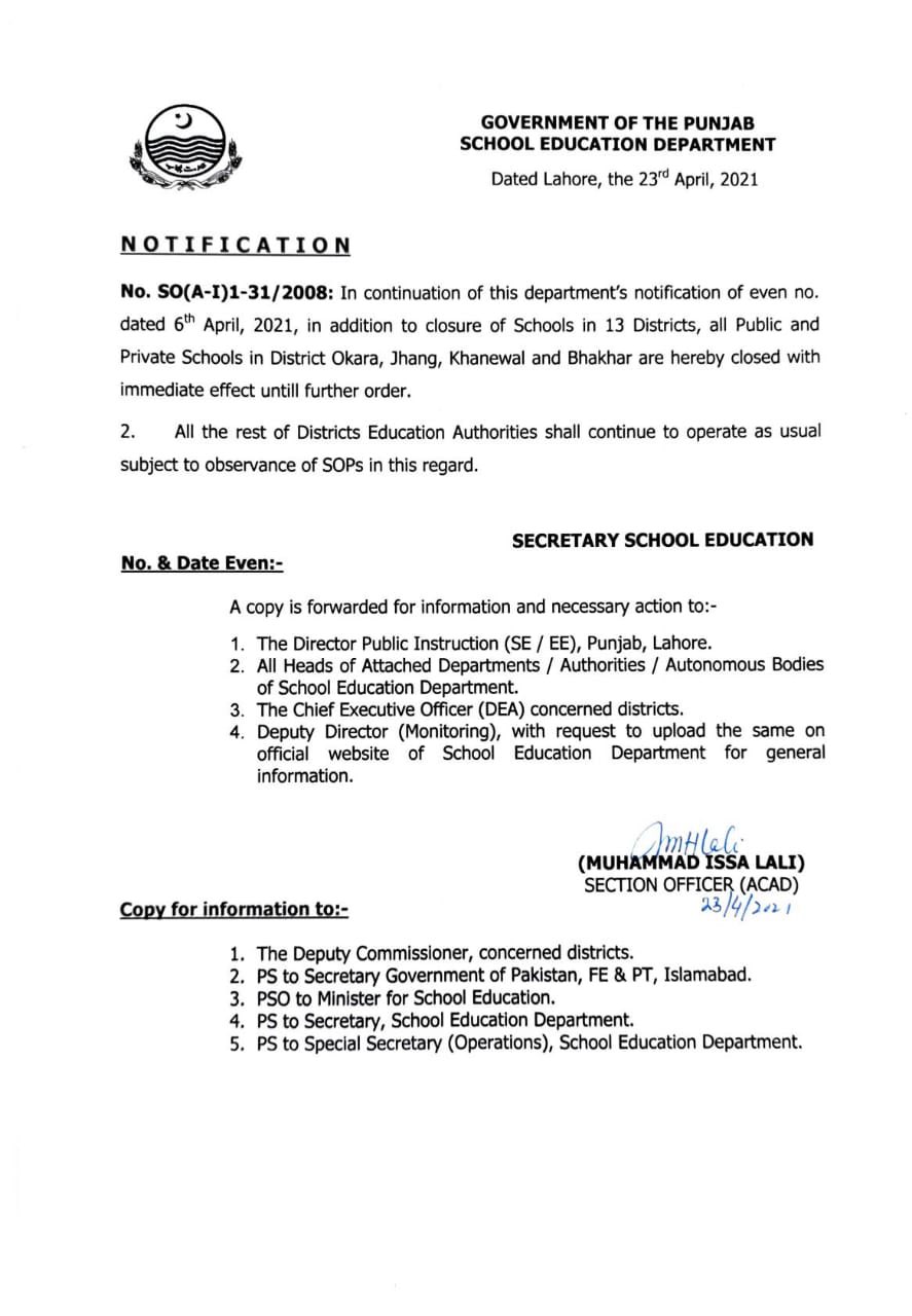 All Public and Private Schools in the following Districts are closed with immediate effect due to the rise in COVID 19 cases. These Districts are in addition to the Districts announced on April 6th, 2021 which are Lahore, Rawalpindi, Gujrat, Gujranwala, Multan, Bhawalpur, Sialkot, Sargodha, Faisalabad, TT Singh, RYK, DG Khan, and Sheikupura.