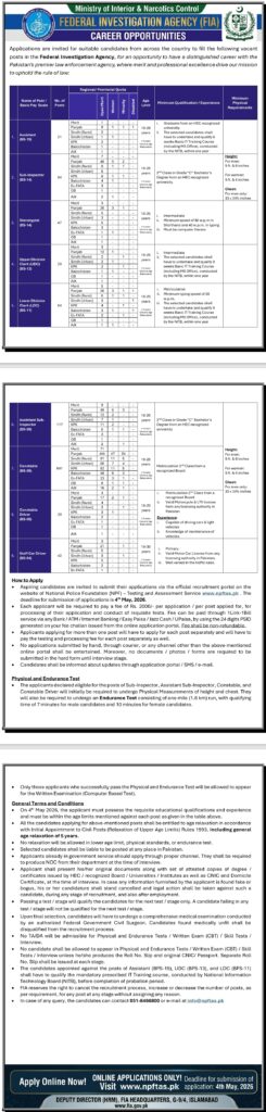 This drive of recruitment is being conducted through the National Police Foundation (NPF) Testing and Assessment Service, with ensuring a transparent, and merit-based process of selection. FIA is known for its professionalism, discipline, and a commitment to upholding the rule of a law in Pakistan. Candidates who are selected through this process will have the opportunity to serve the nation while enjoying a job security, packages of a competitive salary, and opportunities of career growth.